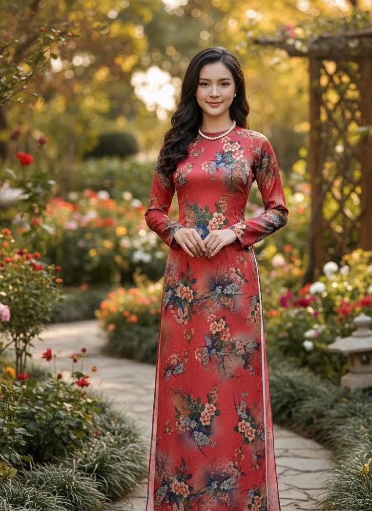 Beautiful Red Floral Brocade Silk Ao Dai Vietnamese Traditional Long Dress for Women