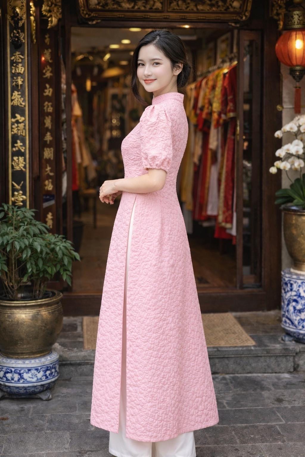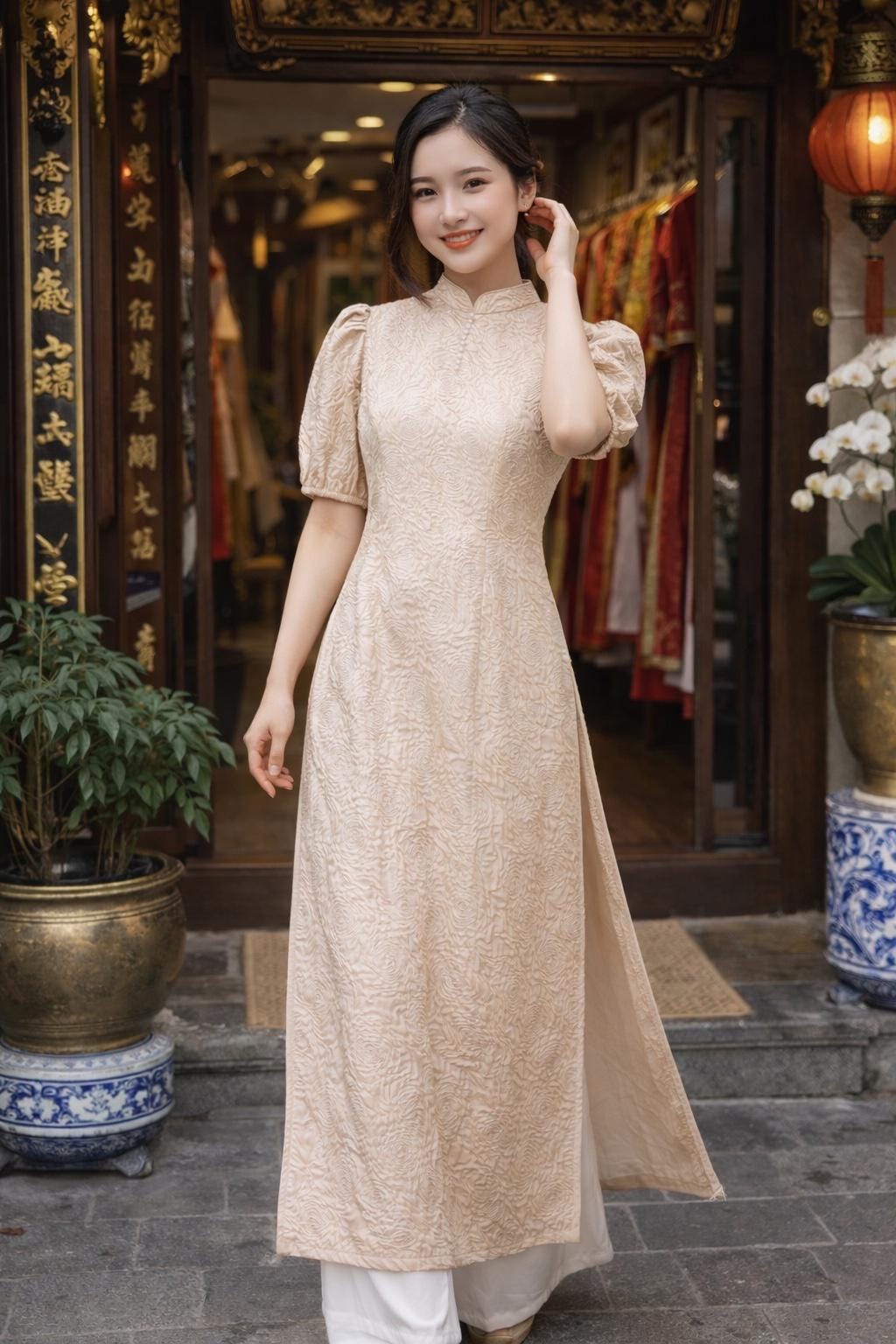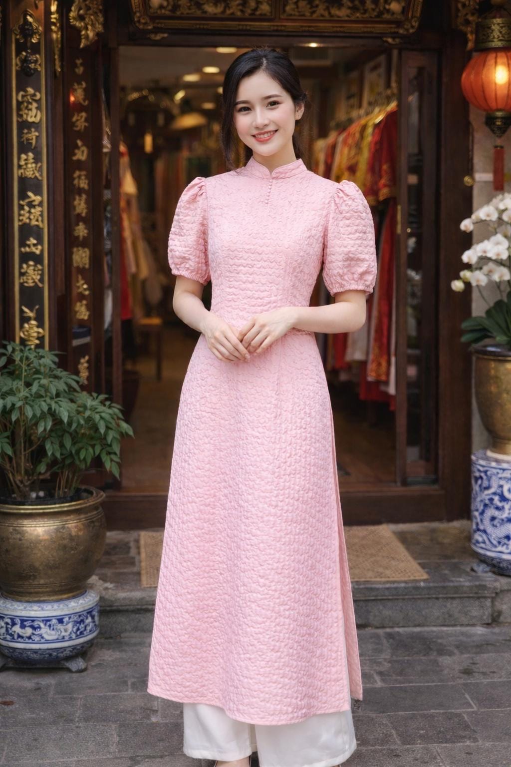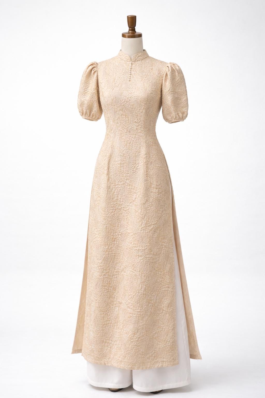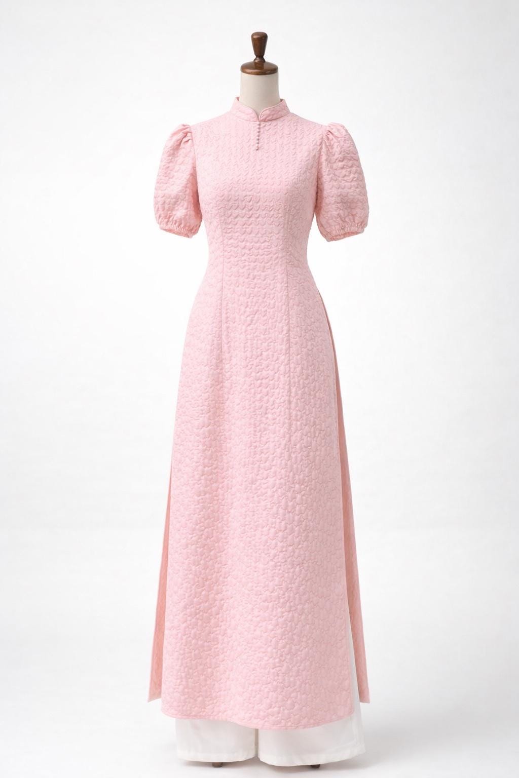 This set includes a Ao Dai and a matching pants.