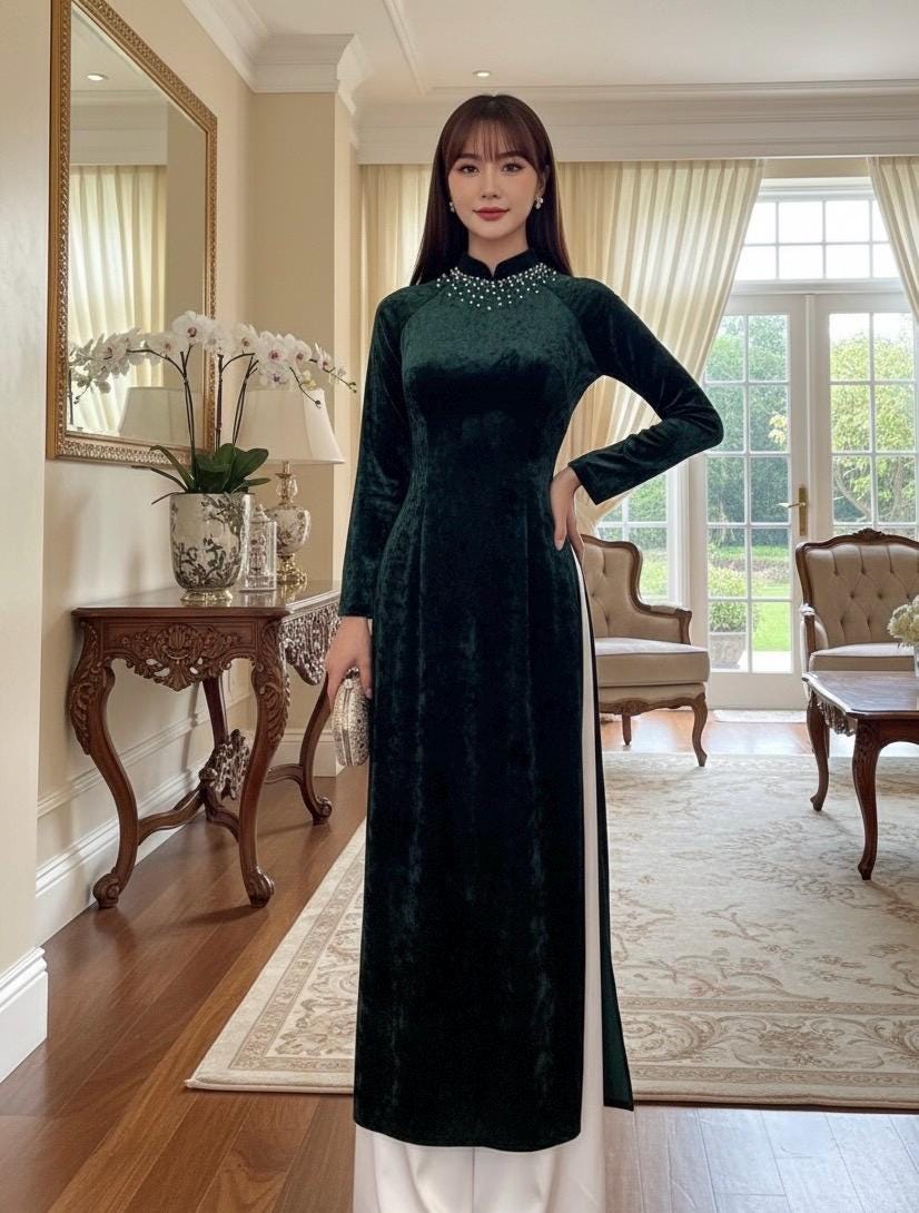 Velvet Green TRADITIONAL Ao Dai Set Red Ao dai For Women, Ao Dai for mother of Bride, Áo Dài Nhung