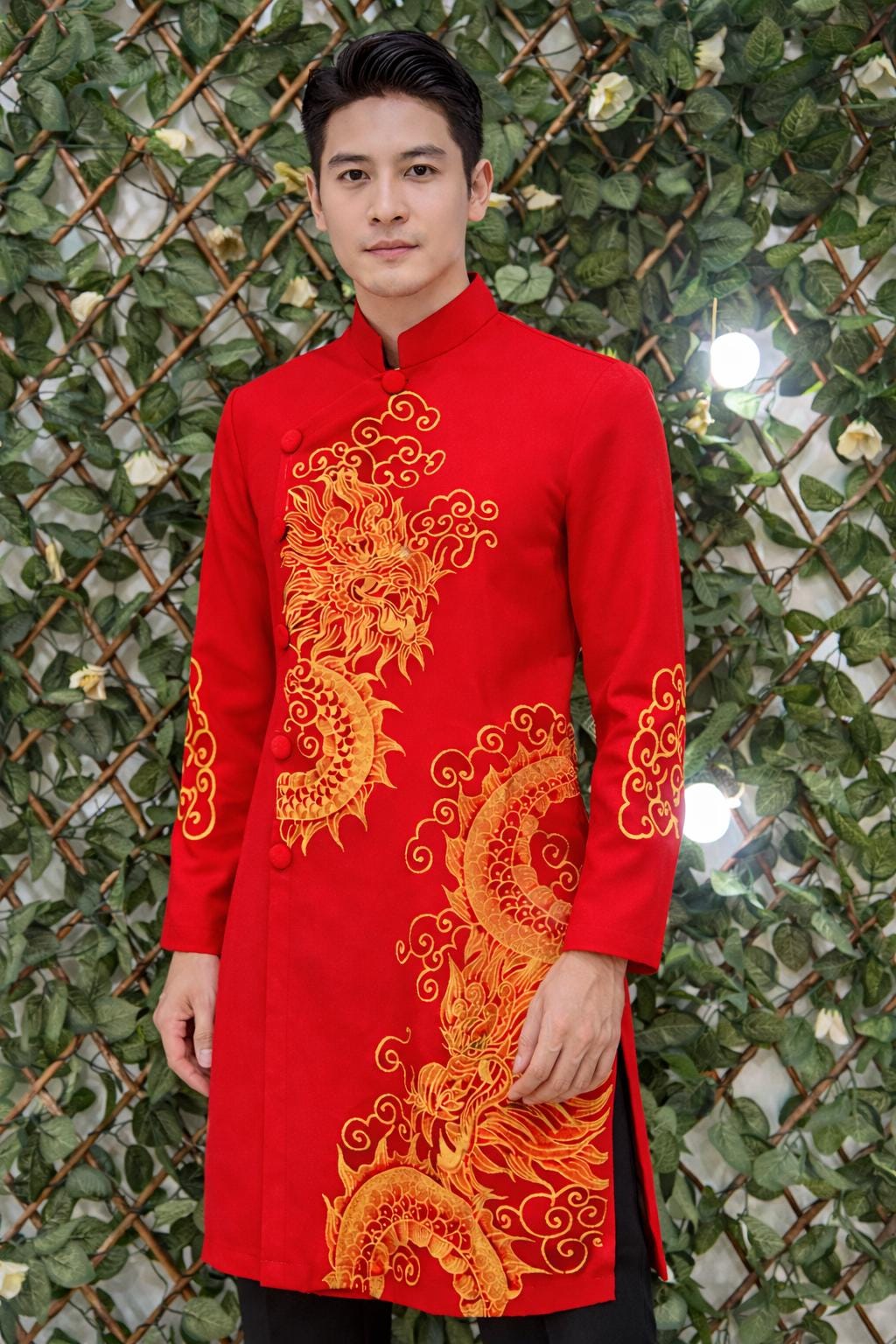 Oil Painting Red Vietnamese Traditional Long Dress for Men, Ao Dai Chu Re, Ao Dai Nam. No pants