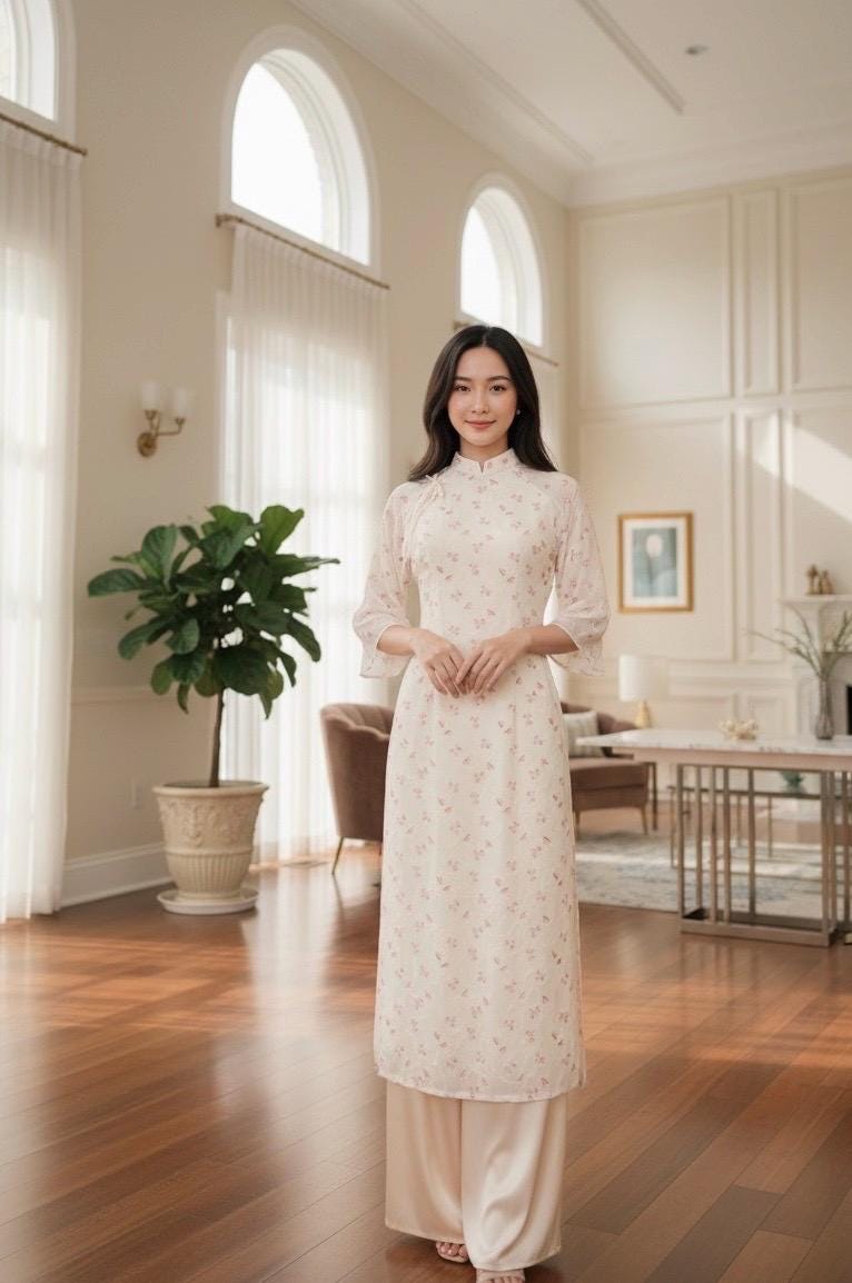 Modernized Nude Embroidered Ao Dai, Ao Dai Viet Nam Cach Tan Cao Cap, Áo Dài việt nam cao cấp