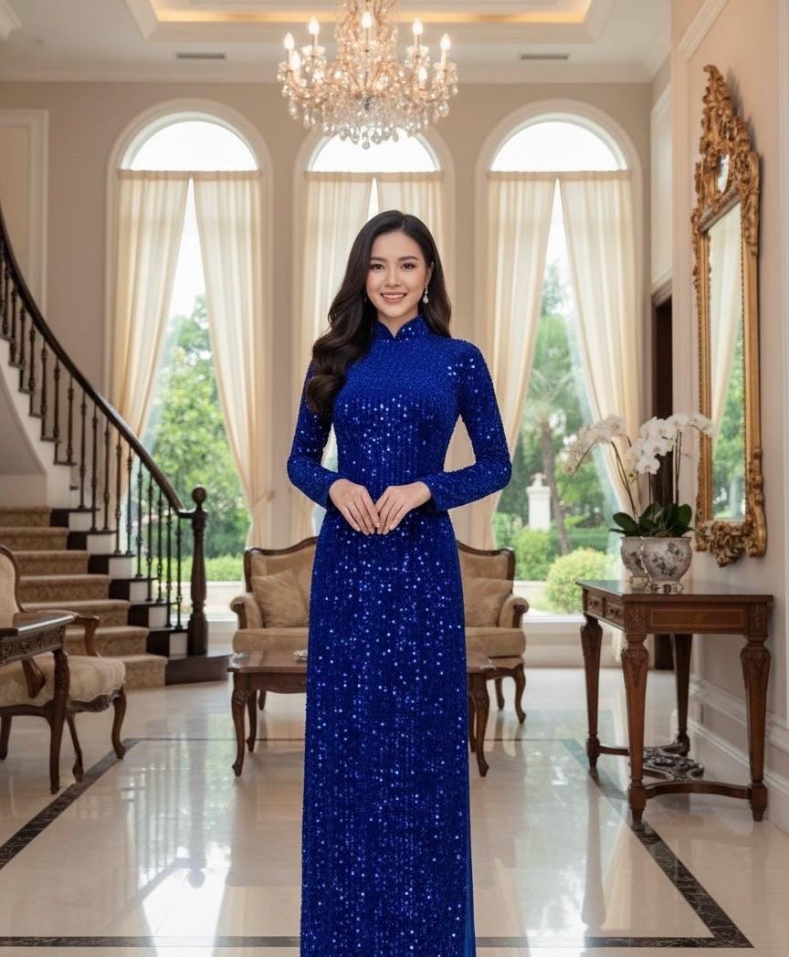 Blue Luxurious Sequin ao dai, Ao dai for Bride mother of Bride/Groom, Ao dai truyen thong Dep