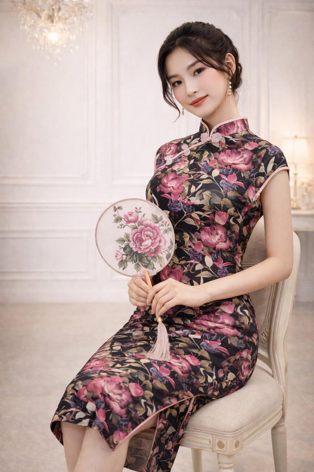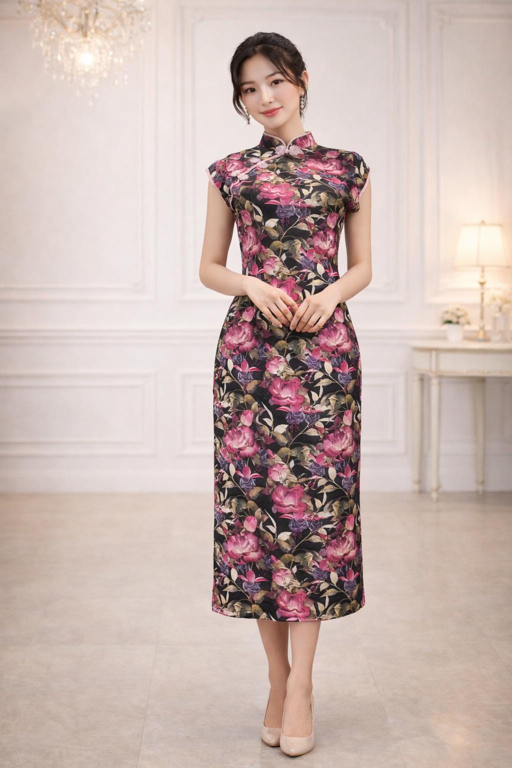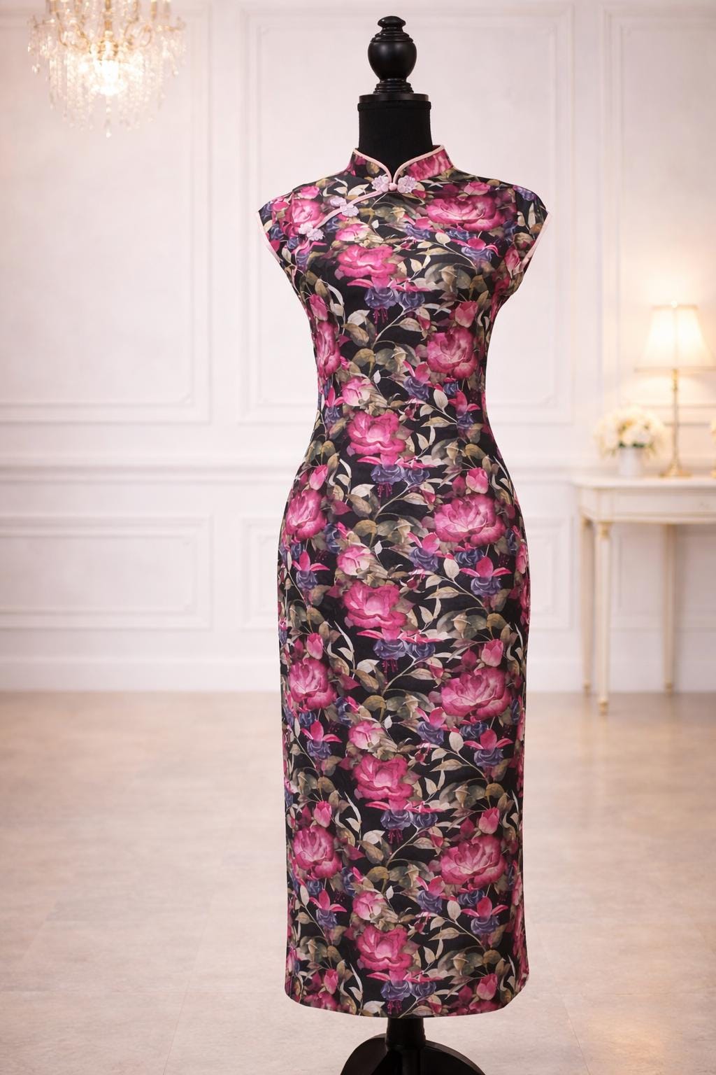 ๐ธ Step into timeless elegance with this stunning black floral cheongsam that beautifully blends traditional charm and modern grace. Featuring a rich black background adorned with vibrant pink roses and lush green foliage, this dress is the epitome of feminine sophistication.