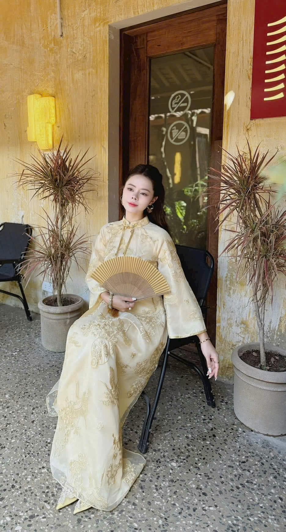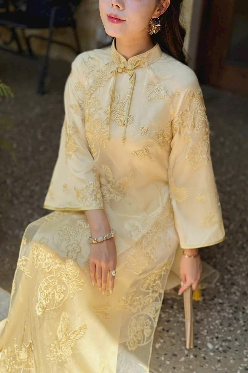 Yellow Modernized Embroidered Ao Dai, Ao Dai Viet Nam Cach Tan Cao Cap, Áo Dài việt nam cao cấp