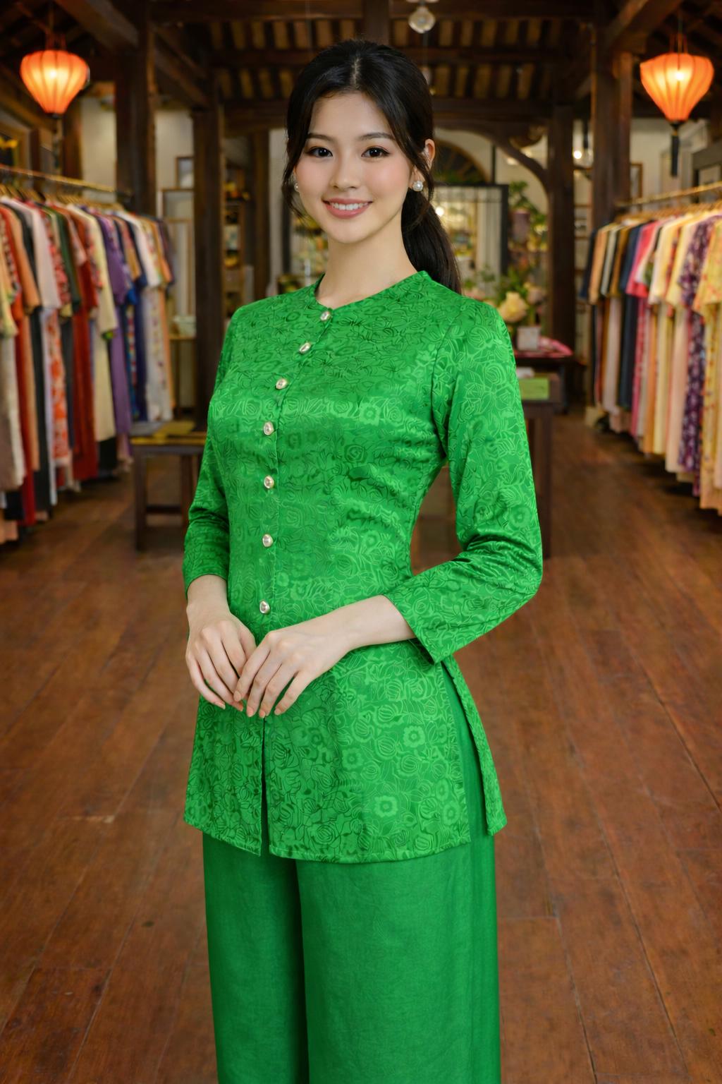 Green/Pink/Red Vietnamese Ba Ba Outfit Traditional Jacquard Tunic & Silk Pants | Elegant Cultural Wear