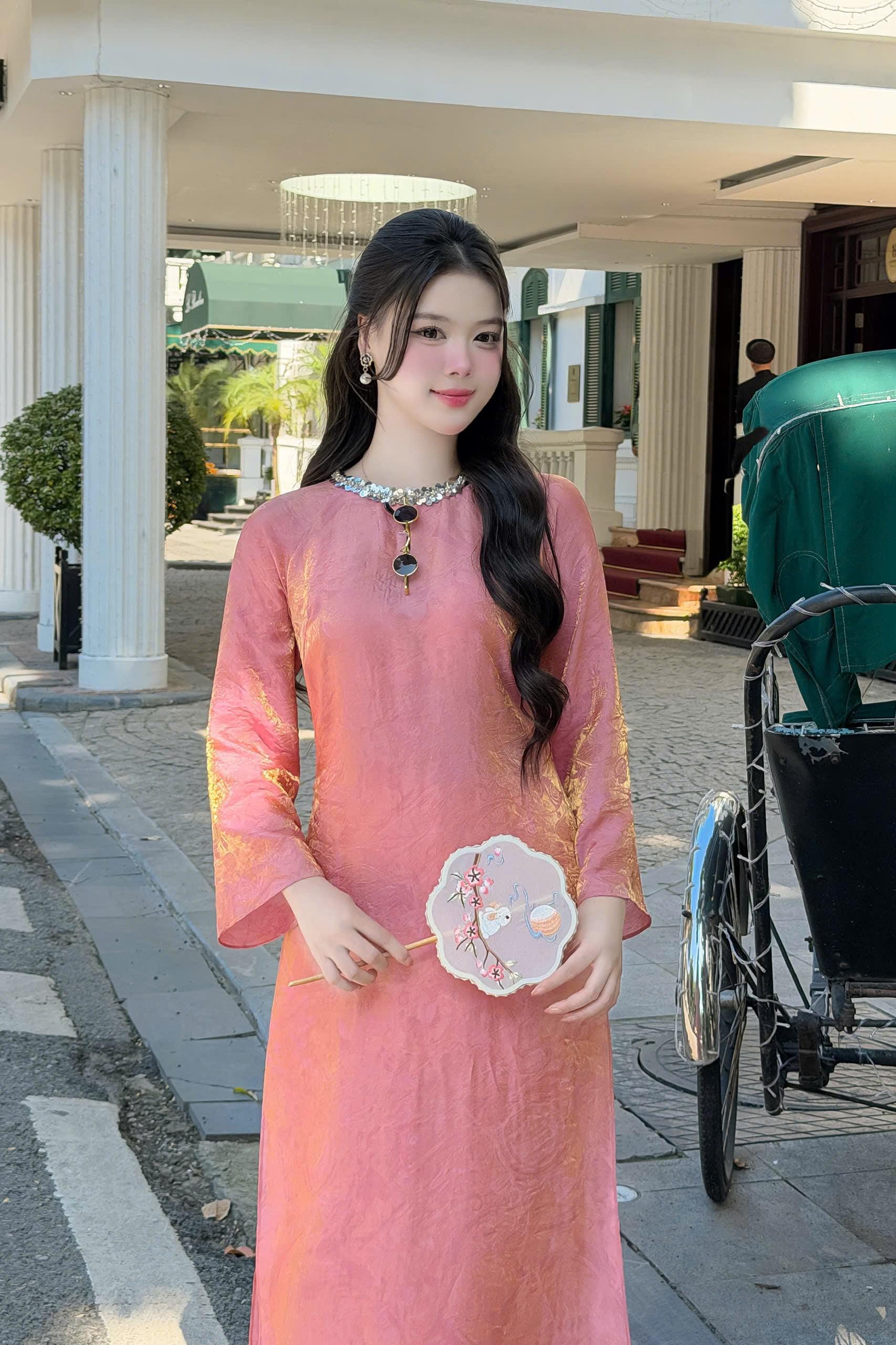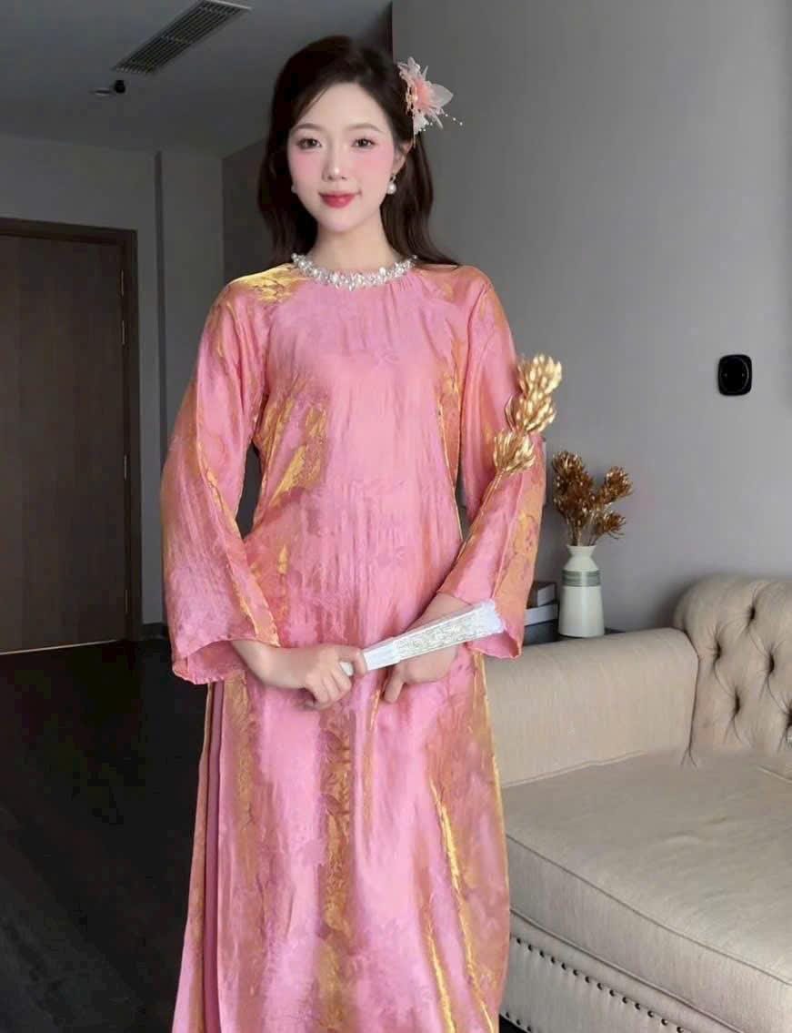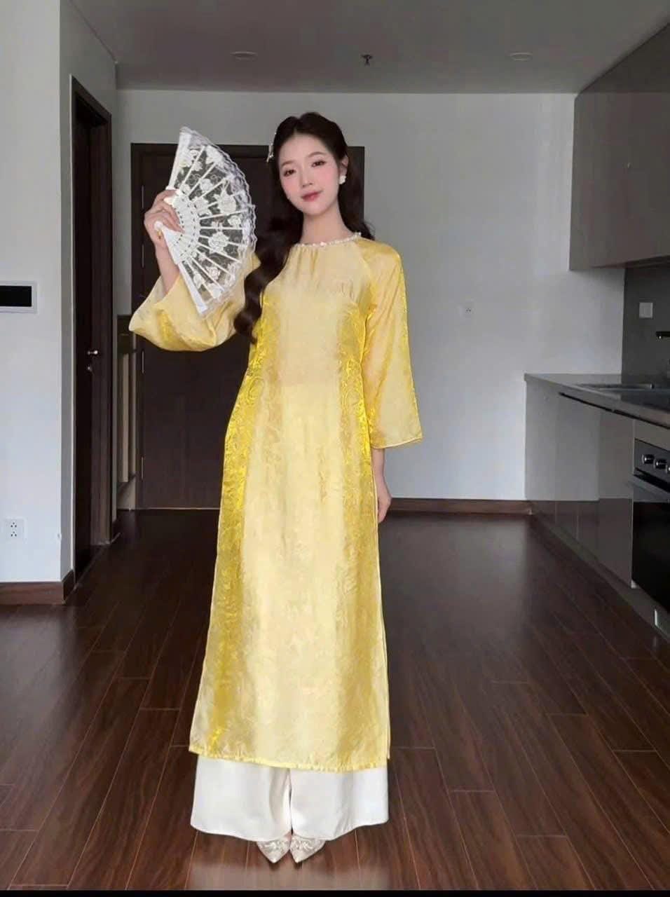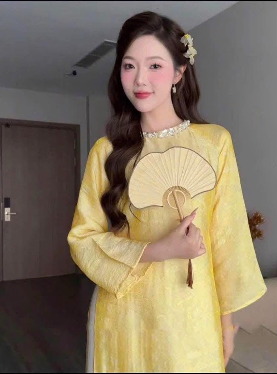 This modern Áo Dài is crafted from premium silk fabric with a soft golden sheen, offering a gentle, luxurious glow without being overly shiny.