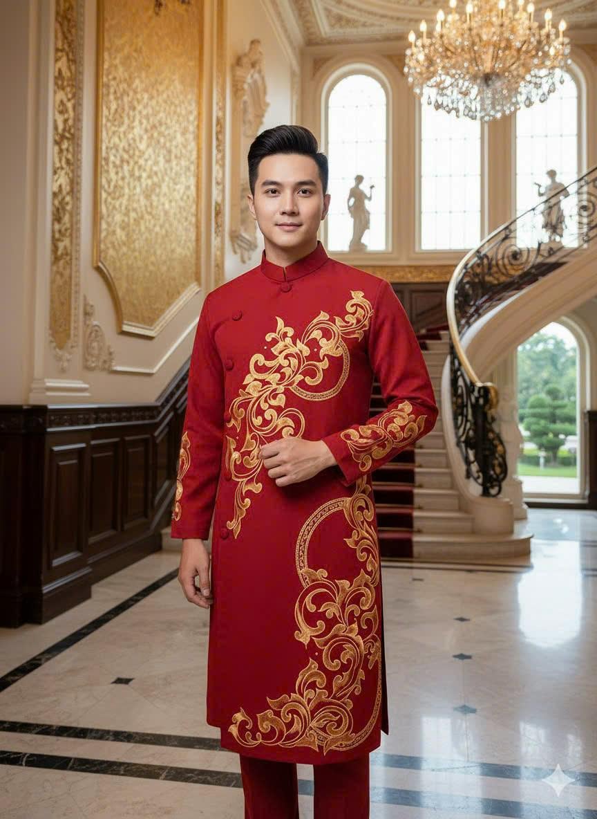 Oil Painting Red Vietnamese Traditional Long Dress for Men, Ao Dai Chu Re, Ao Dai Nam. No pants